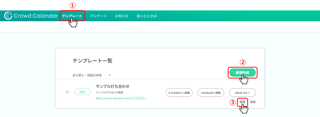①「テンプレート」タブをクリックすると、テンプレート一覧画面が表示されますので、