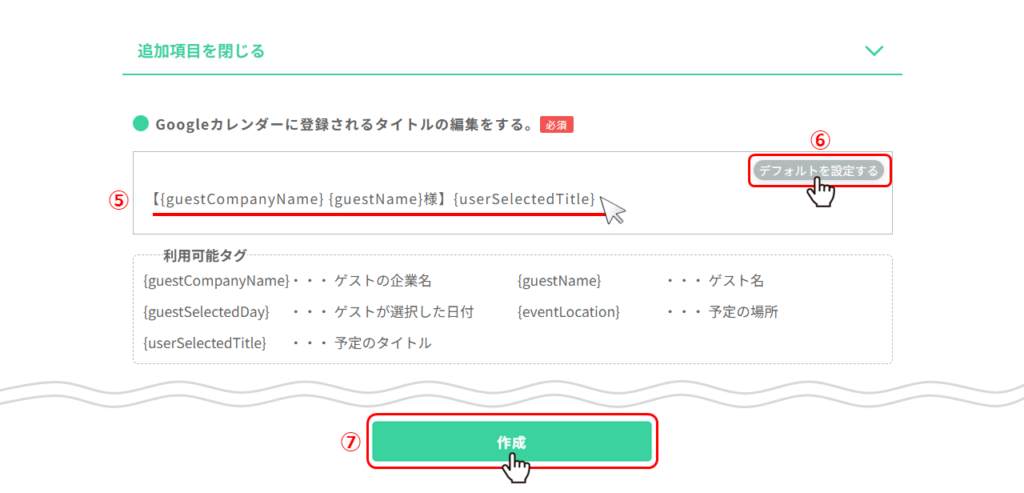 ⑤Googleカレンダーに登録されるタイトル名を下欄の利用可能タグを利用して編集します。