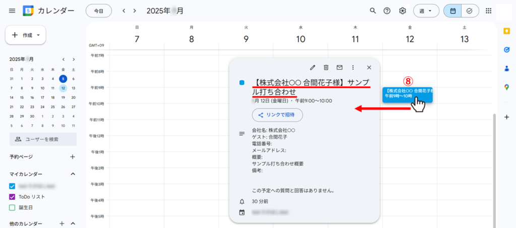 ⑧Googleカレンダーに、設定したタイトル名で予定が登録されます。